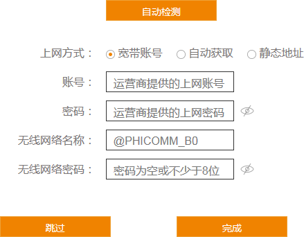 一般家庭用户选择【宽带账号】上网方式,网络运营商会提供给您用户名及密码; 网络运营商未提供任何网络参数时,一般选择【自动获取】上网方式; 一般公司网络可能会用到【静态地址】上网方式。 4;设置密码;